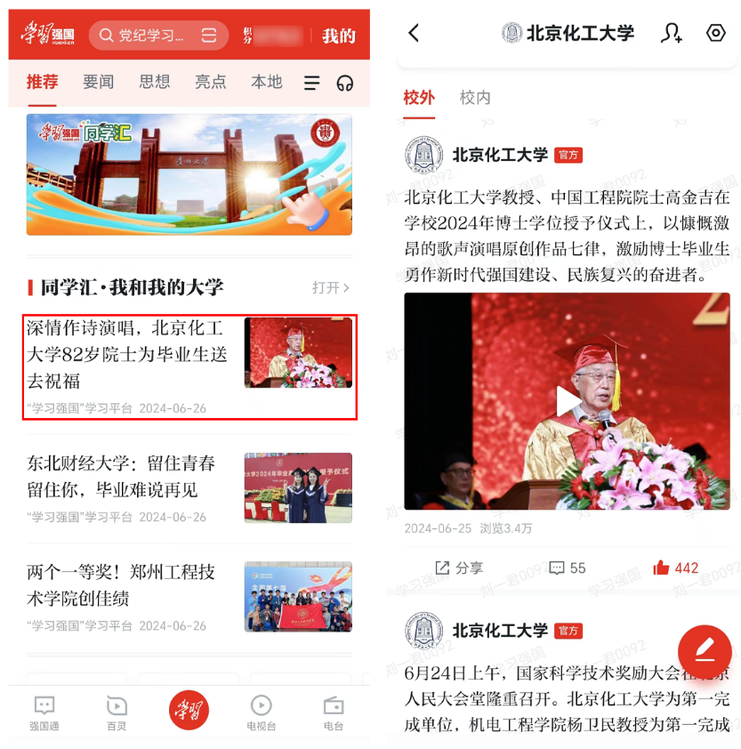 近日,在北京化工大学2024年博士学位授予仪式上,82岁的中国工程院院士高金吉作为博士生导师代表发言。发言结尾,他慷慨激昂地演唱了原创诗歌作品七律,引得台下掌声不断。他激励毕业生勇做新时代强国建设、民族复兴的奋进者。相关视频在网络发布后,先后被“学习强国”平台首页推荐、北京日报客户端等媒体转发报道,各平台视频累积播放、点赞超5万人次。