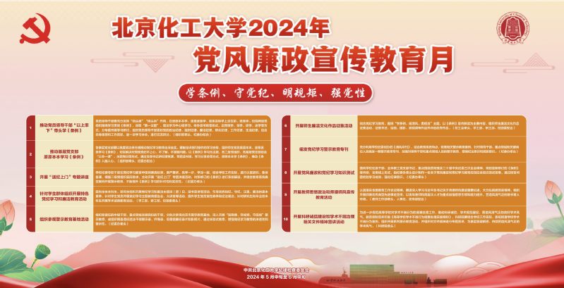 2024年北京化工大学党风廉政宣传教育月以“学条例、守党纪、明规矩、强党性”为主题,5月中旬到6月中旬深入开展“十个一”系列活动。